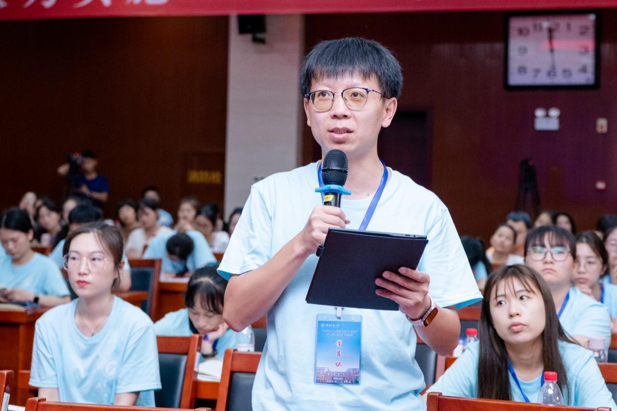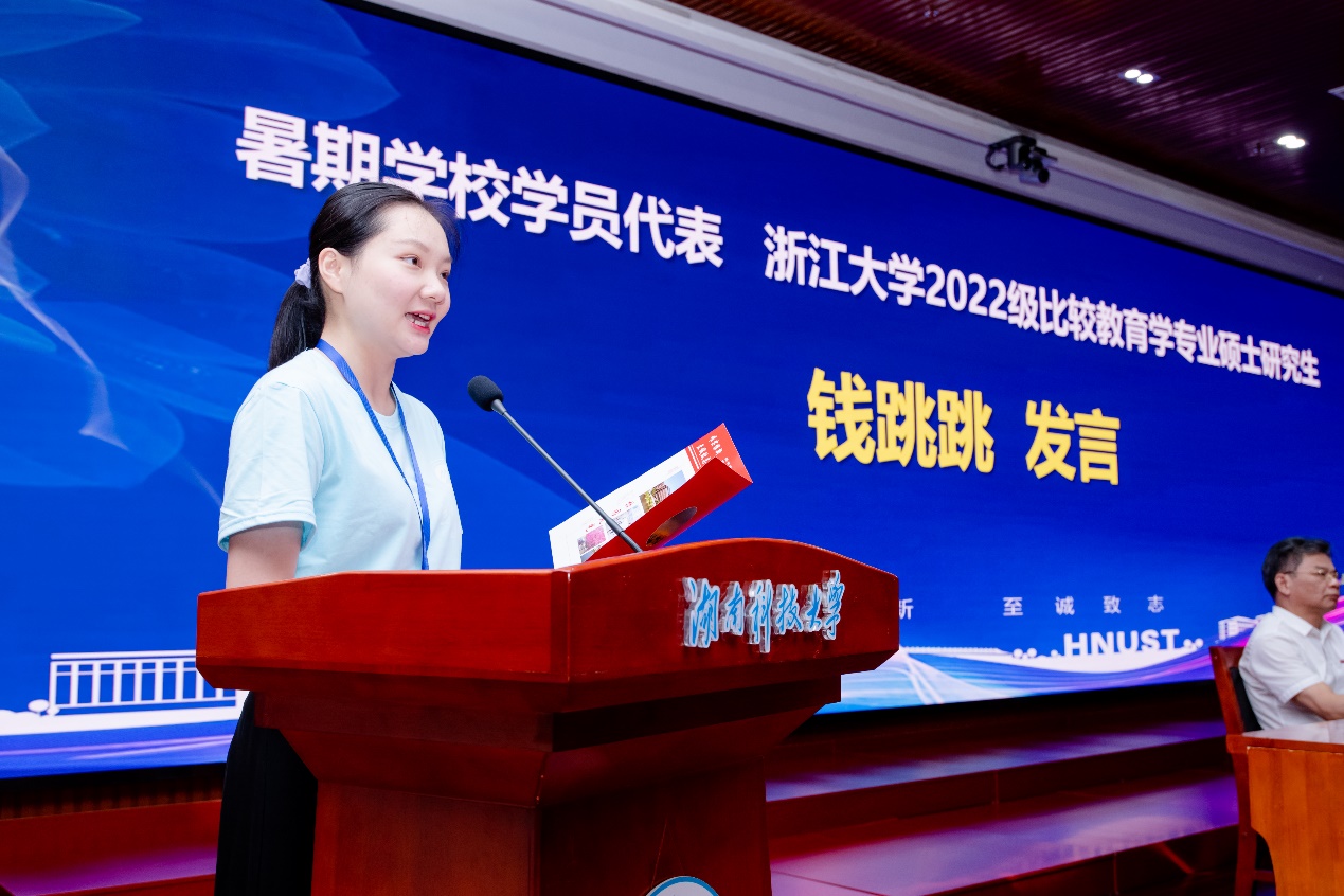 浙江大学2022级比较教育学专业硕士研究生钱跳跳同学作为学员代表发言。她首先对各位领导和老师为举办研究生暑期公司付出的辛勤劳动表示感谢。她表示,一定满怀学习热情、珍惜学习机会,结识更多良师益友;拓宽学术视野、提升学科素养,努力提升研究能力,在湖科大度过一段充实而又难忘的暑期时光。