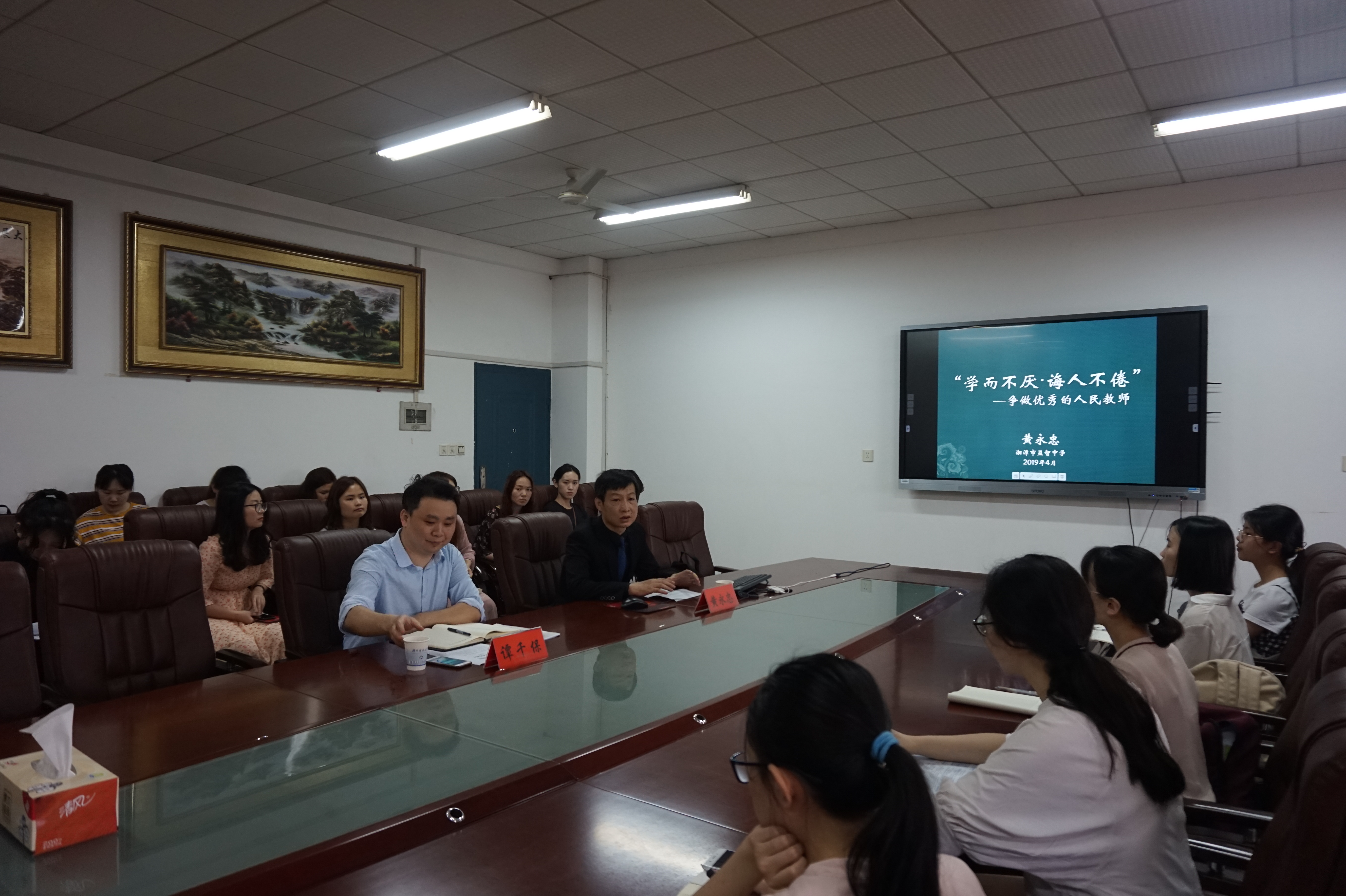 2019年4月26日下午,湘潭市益智中学党支部书记黄永忠高级教师做客“名师进研究生课堂”,为公司师生带来了题为“‘学而不厌?诲人不倦’:争做优秀的人民教师”的报告。报告会由永利3044集团官网副经理谭千保博士主持。