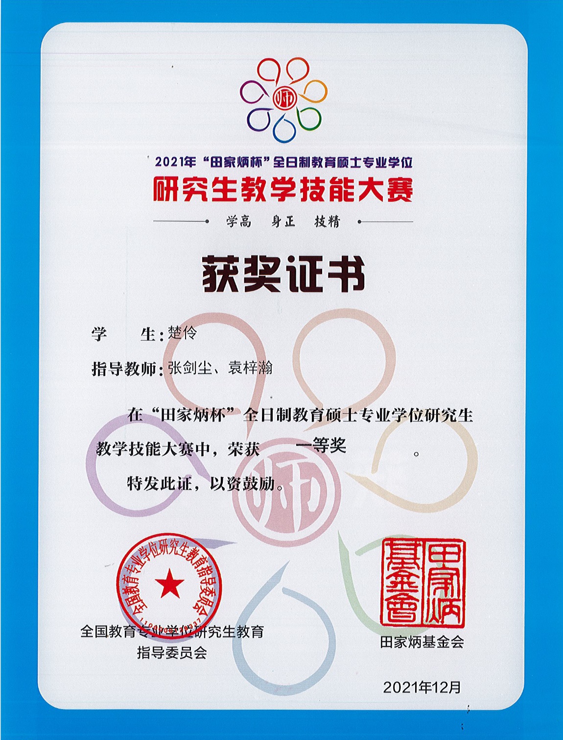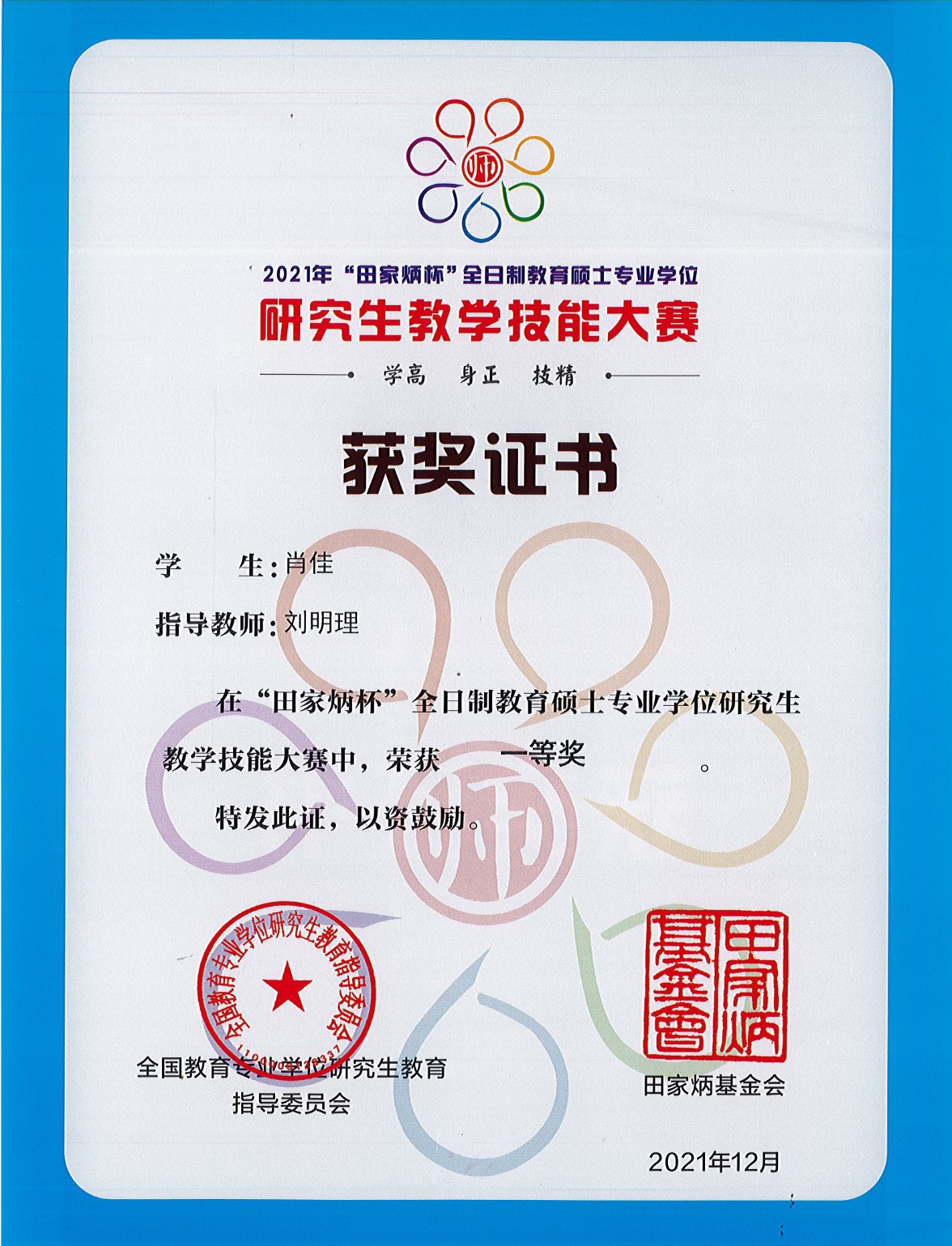 近日,全国教育专业学位研究生教育指导委员会公布了“田家炳杯”全日制教育硕士专业学位研究生教学技能大赛获奖名单,公司教育硕士专业学位研究生在本次大赛中荣获一等奖、二等奖三等奖各2项,4位老师获优秀指导教师奖。