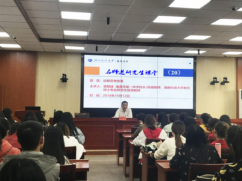 2018年10月12日下午,湘潭市第一中学董事长唐新建做客“名师进研究生课堂”,为公司师生带来了题为“谈新高考改革”的报告。报告会由永利3044集团官网副经理谭千保主持。